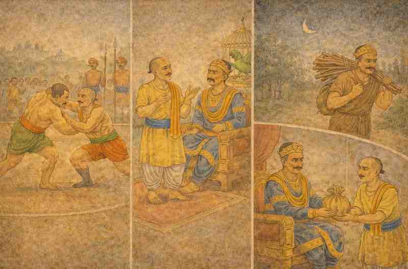 एक बार दिल्ली का एक पहलवान विजयनगर आया। उसने विभिन्न मल्लयुद्ध प्रतियोगिताओं में भाग लिया। दिल्ली के पहलवान से सब हार गए। राजा को इस बात पर शर्मिंदगी महसूस हुई। वह पहलवान को पराजित देखना चाहते थे।